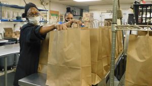 (l-r) Jewell Burgess and Angie Griffin are busy packing lunches for families at the Salisbury Center. Not pictured: Karen Evans