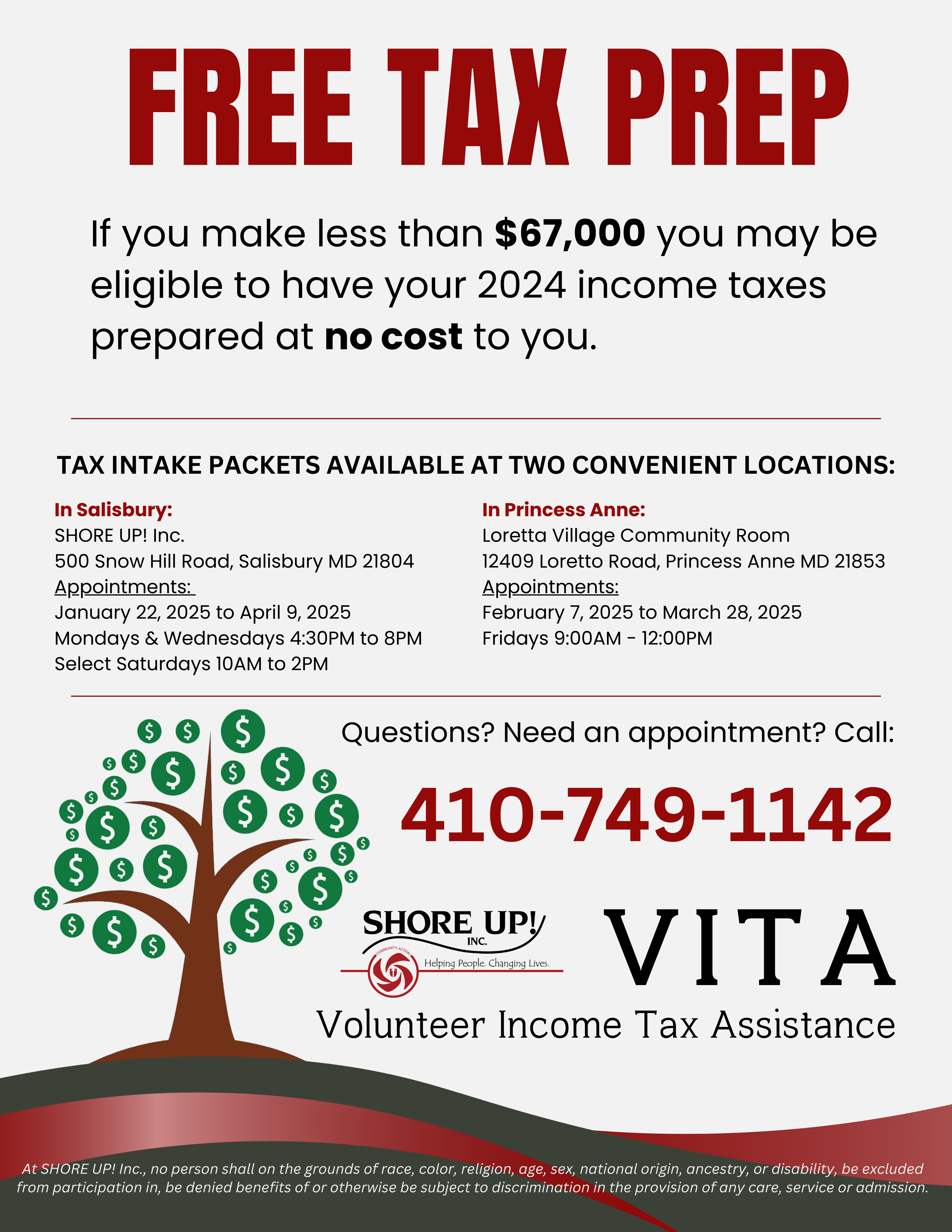 For additional information, contact our Tax Office at eitc@shoreup.org, or call 410-749-1142 x 1903.
